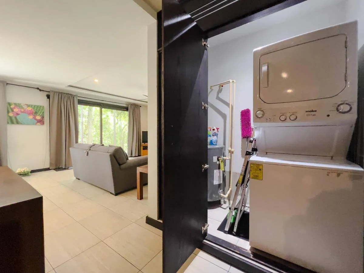 The interior layout stands out for its functionality and flow. The main living area connects naturally to a covered terrace, the ideal spot for morning coffee or an afternoon of reading in the tropical breeze. Additionally, it features a convenient independent laundry area, a detail that adds significant practical value to daily life.